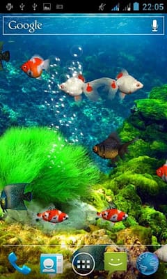 Живые обои Аквариум на телефон с качественной анимацией и звуками. Благодаря им главный экран мобильного устройства станет «окном» в подводный мир с экзотическими рыбками, пузырьками воздуха, водной растительностью и разноцветными кораллами. В зависимости от настроек меняется фон, количество рыбок и пузырьков.